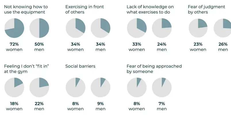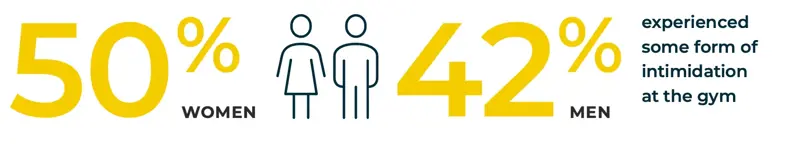 - Nearly half of all participants experience some form of gym intimidation—particularly among women (50% vs. 42% for men).