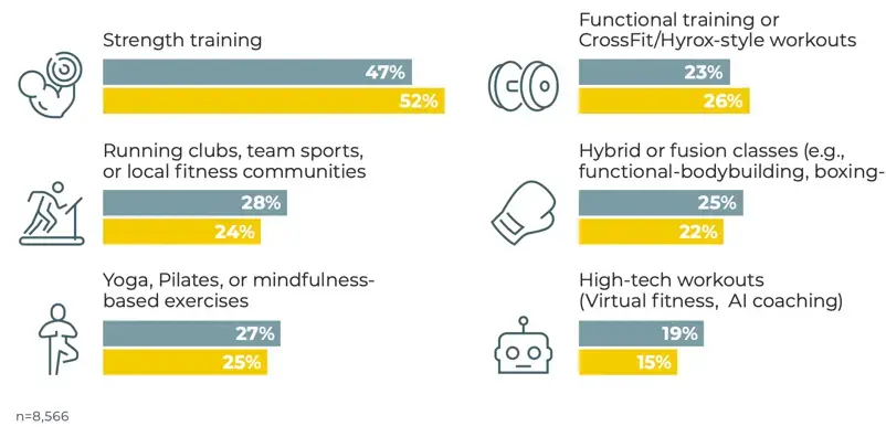- Functional training (CrossFit, Hyrox-style workouts) appeals to roughly a quarter in both markets (23% in KSA, 26% in the UAE).
