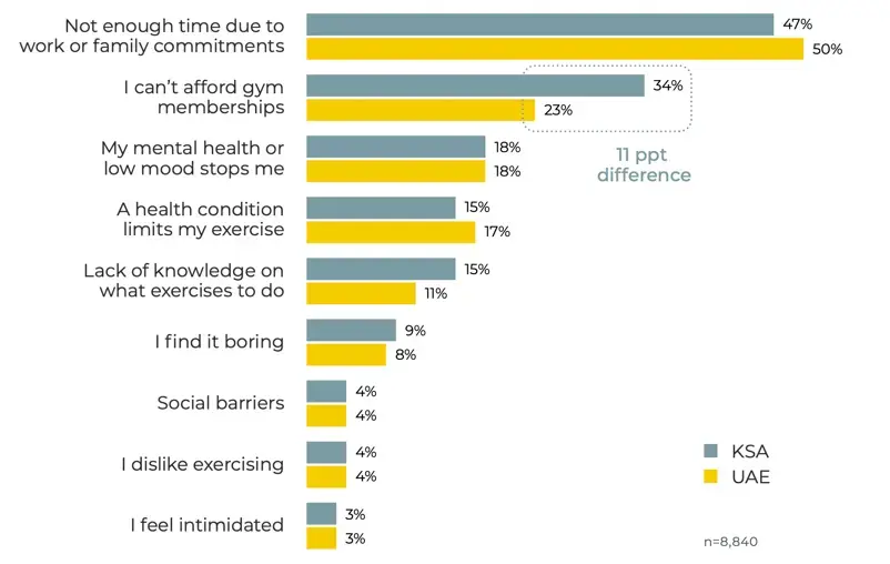 Additionally, independent research from the Health & Fitness Association (2024) indicated that 25% of young Saudi women reported a lack of nearby facilities as the main barrier to physical activity. This finding, combined with our large-scale survey showing that availability and price are significant limiting factors to the growth and accessibility of fitness in the Middle East, underscores the need for more affordable gym options and an increase in fitness centres that cater to the region’s young population.