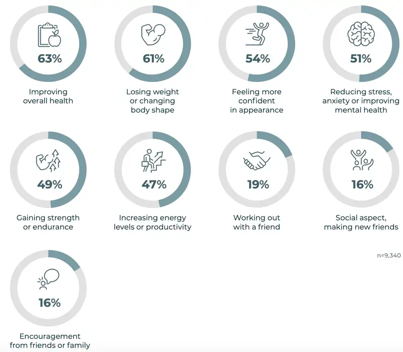 Improving one’s health is the number one motivator, closely followed by body composition goals, at 63% and 61% respectively. This ties back to our earlier research where 92% of respondents aspired to improve their health, and is a great sign of the region’s work in supporting the nations’ health and fitness. Coming in third is feeling more confident with their appearance at 54%, and fourth is reducing stress and improving mental health at 51%, followed by 49% wishing to get stronger or improve their endurance. Interestingly, working out with friends, or the social aspects, don’t seem to be very strong motivators, as only 19% of people say working out with a friend motivates them to exercise.