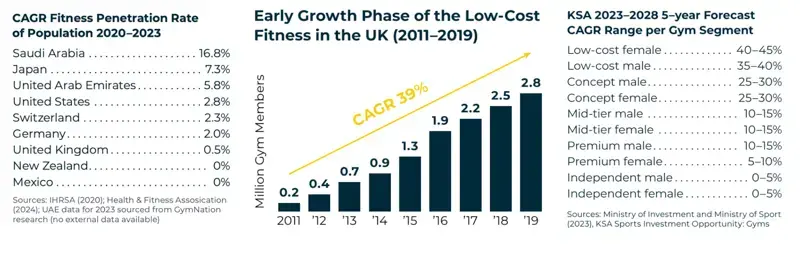 - The Middle East is currently experiencing an early growth phase in the low-cost, high-value gym sector, akin to what the UK saw in 2011. During that period, low-cost gym memberships in the UK grew at a CAGR of 39% over eight years, while traditional private gyms saw no net growth. Memberships in low-cost gyms increased from 200,000 to 2.8 million, leading to an increase in the UK’s gym penetration rate from 11.9% to 15.6%.