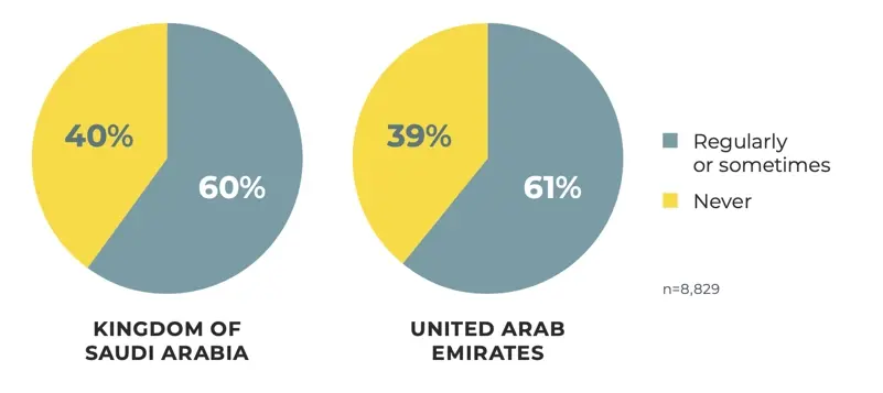 - 60% in Saudi Arabia and 61% in the United Arab Emirates report using wearables regularly or sometimes, leveraging features like heart rate monitoring, step tracking, and calorie counting to stay accountable and optimise their fitness routines. However, despite the growing popularity of digital tracking, there remains a significant portion of the population who are not embracing this tech:
