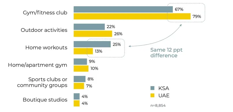 Saudi Arabia, on the other hand, shows a parallel 12 percentage points lean towards home workouts, likely shaped by factors such as gym accessibility, pricing, and cultural norms.