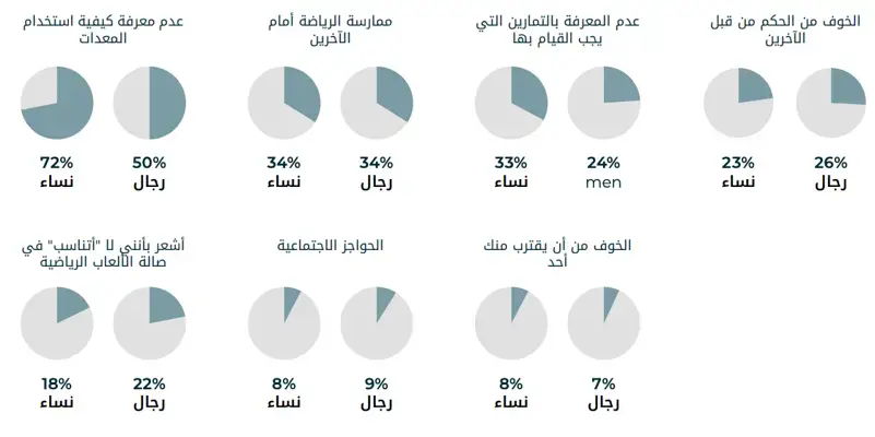 - ما يقرب من نصف المشاركين يعانون من شعور بعدم الراحة في الصالة الرياضية، خاصة بين النساء (50% مقارنة بـ 42% للرجال).