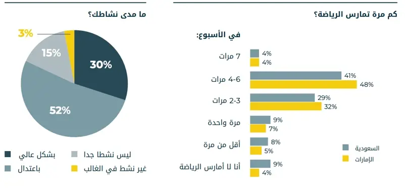 بشكل عام، ذكر 82% من المشاركين في الاستطلاع أنهم نشيطون إلى حد ما على الأقل، بينما وصف ۳۰% منهم أنفسهم بأنهم نشيطون للغاية، وأشار 3% فقط إلى أنهم غير نشيطين على الإطلاق. وهذا يتماشى مع الرغبة المعلنة سابقاً في تحسين الصحة والرفاهية. وعند النظر إلى عدد المرات التي يمارس فيها الأشخاص التمارين الرياضية بالفعل، نجد أن 79% منهم يمارسون التمارين الرياضية مرتين على الأقل أسبوعياً بشكل منتظم.