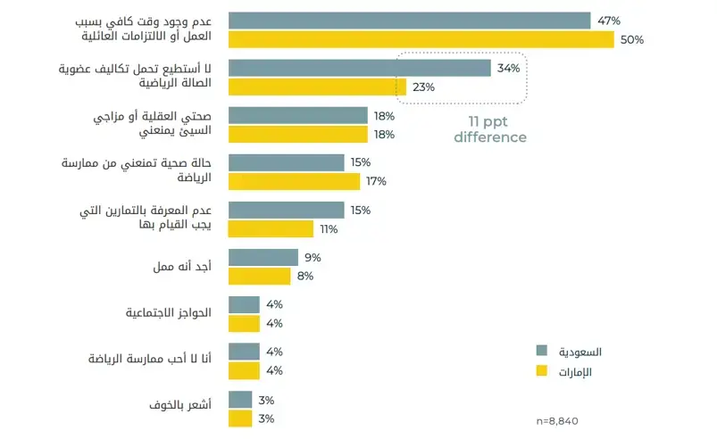 - التكلفة هي العائق الأكبر بالنسبة لغير الأعضاء: 51% في المملكة العربية السعودية و53% في الإمارات العربية المتحدة يعتقدون أن عضوية الصالات الرياضية باهظة الثمن.
