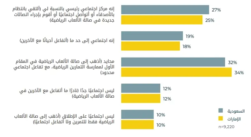 ■ البعد الاجتماعي: يرى نحو نصف الأشخاص أن الصالة الرياضية جزء لا يتجزأ من حياتهم الاجتماعية.