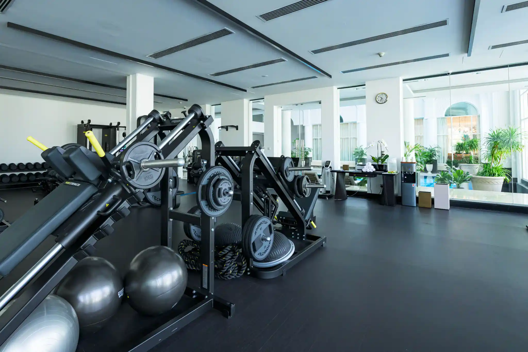 Luxury hotel fitness facility offering unisex and ladies-only gyms with 24-hour access, natural light, top-quality equipment, group classes (spinning, yoga, aerial yoga, Iron Body), and private training.